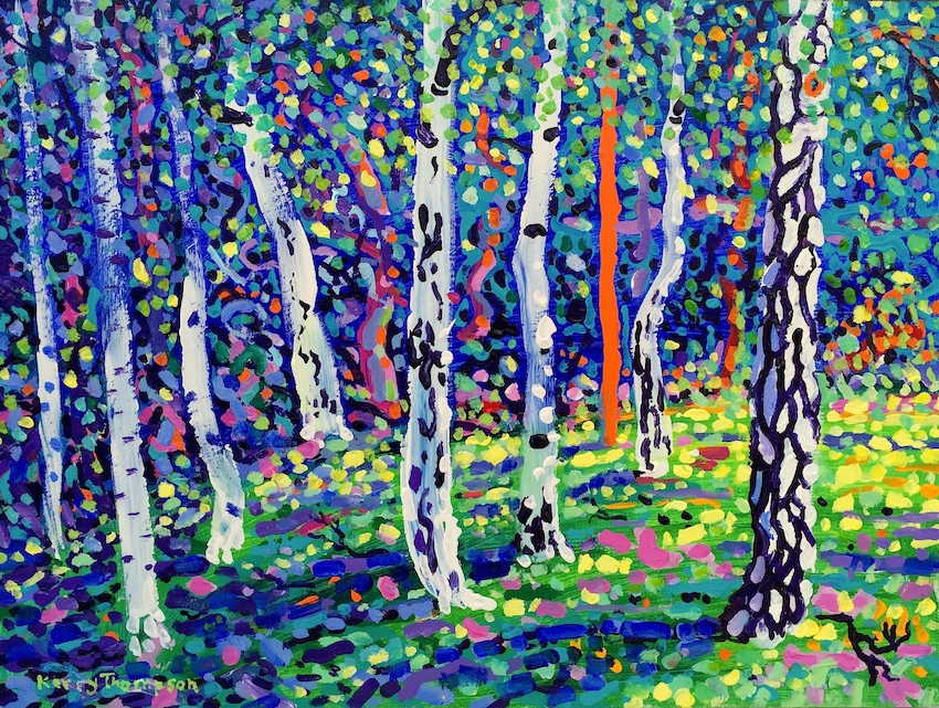 Painted on a property at Birchs Bay in southern Tasmania, I was interested in the individuality of markings in this stand of birch trees.